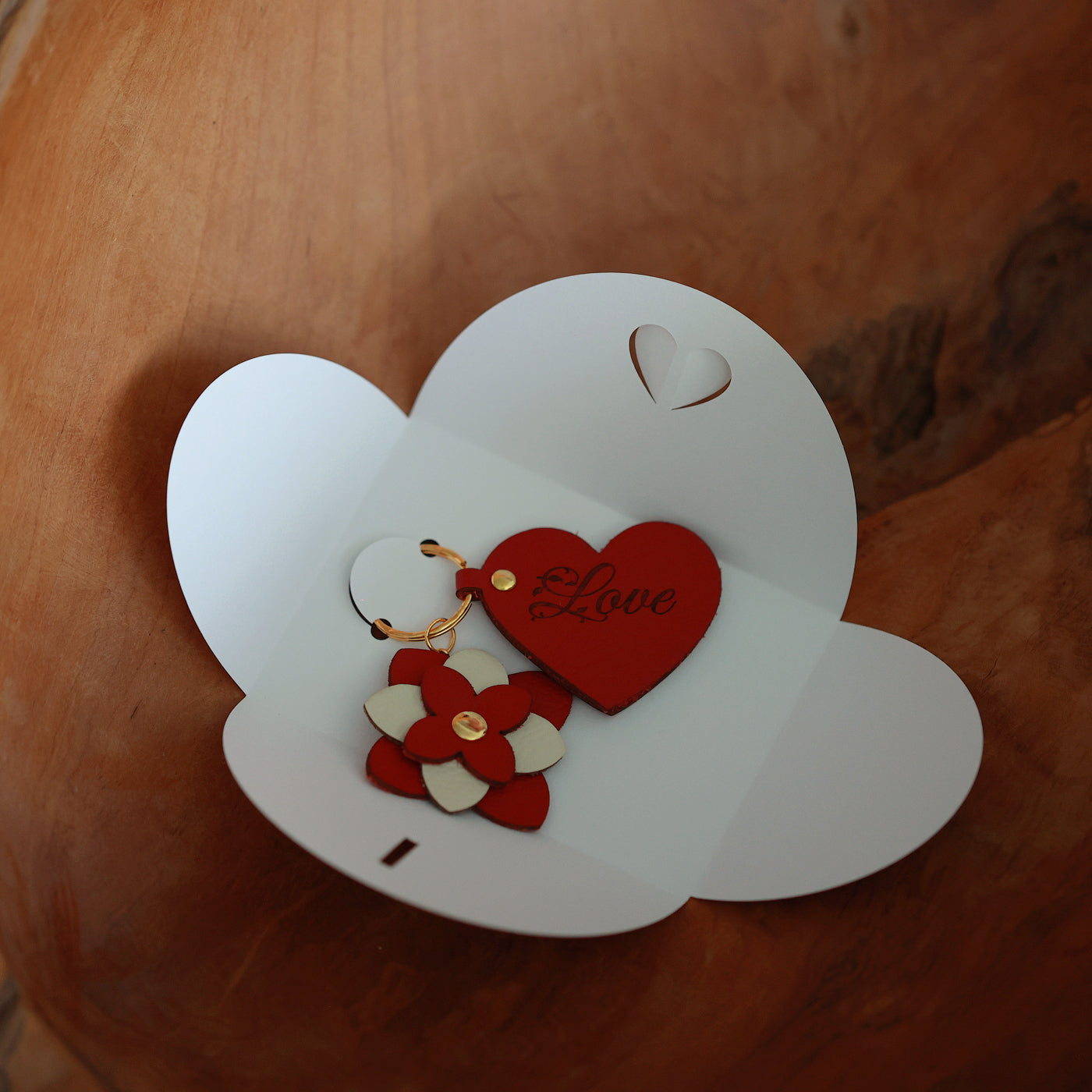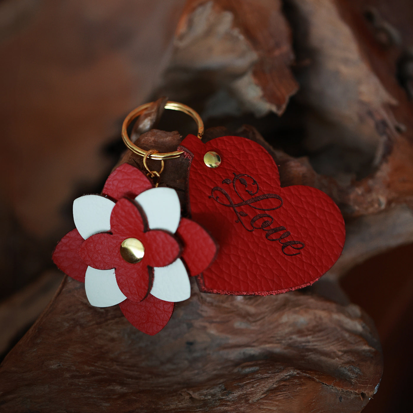 Leder-Schlüsselanhänger mit Blume und Herz – Handgefertigt, Love-Gravur, Valentinstagsgeschenk