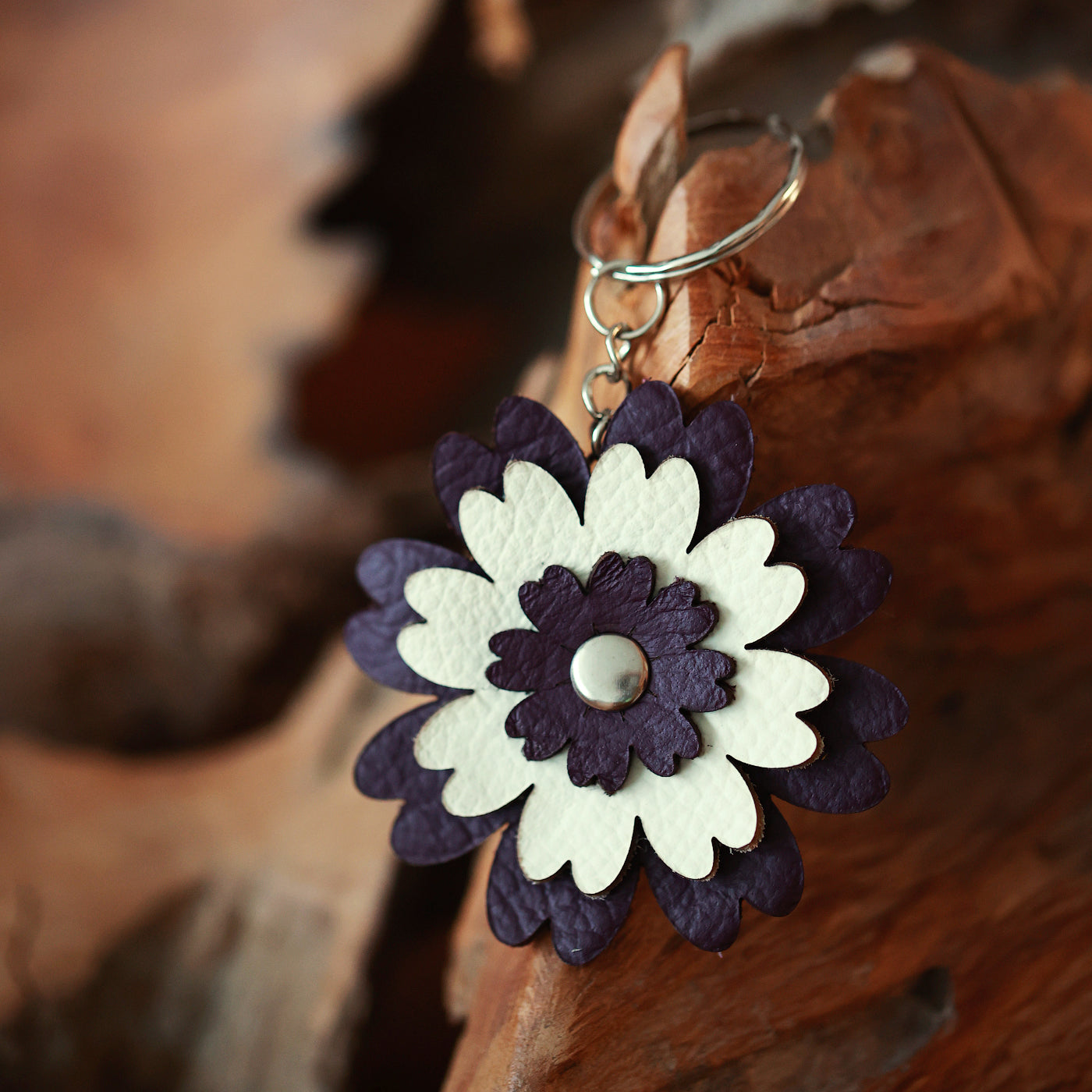 Leder-Schlüsselanhänger mit lila-weißer Blume – Handgefertigtes Accessoire, Taschenanhänger, Valentinstagsgeschenk