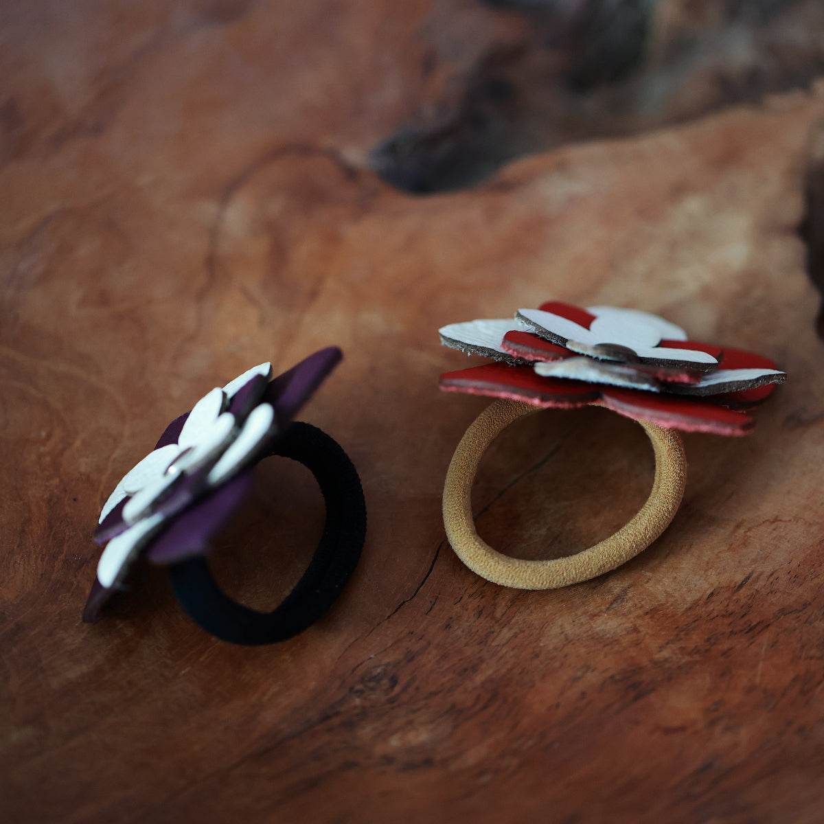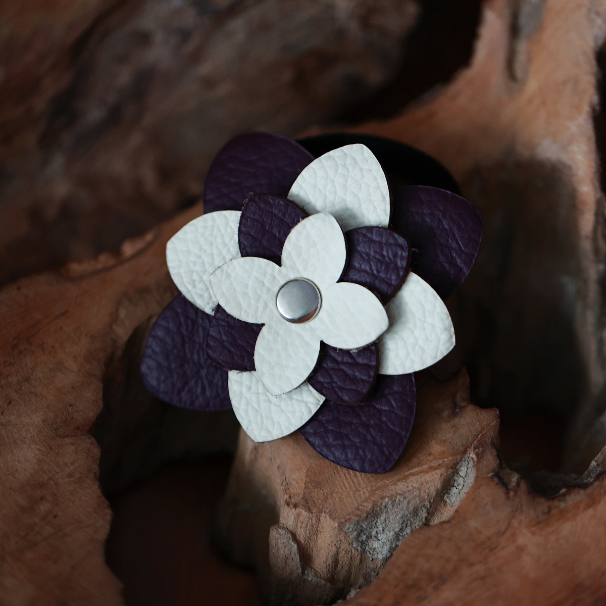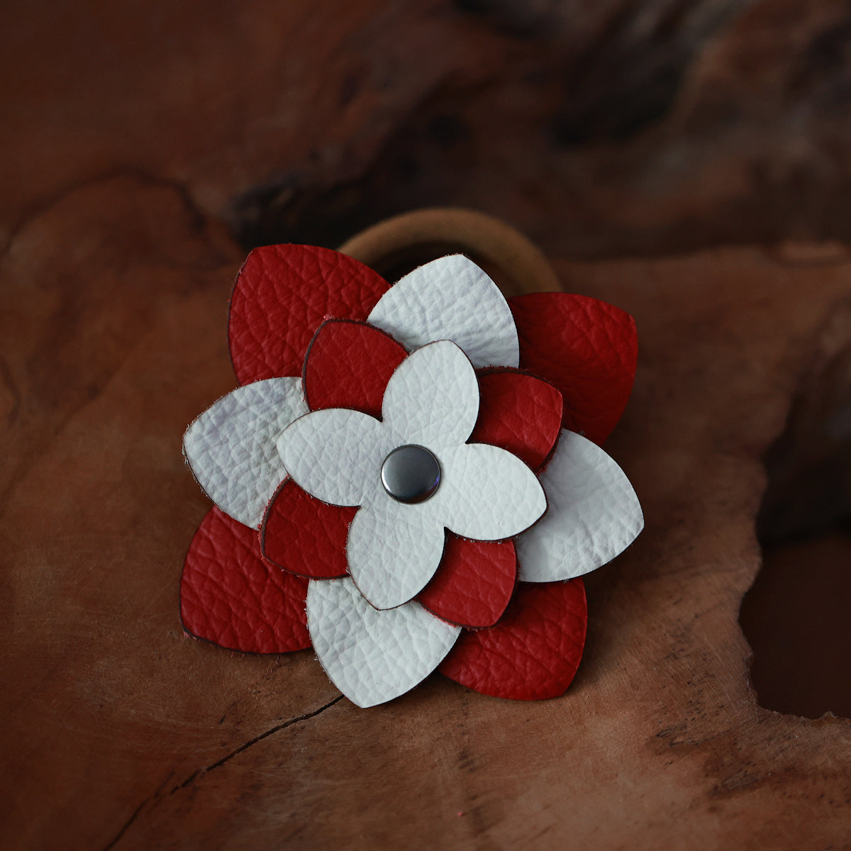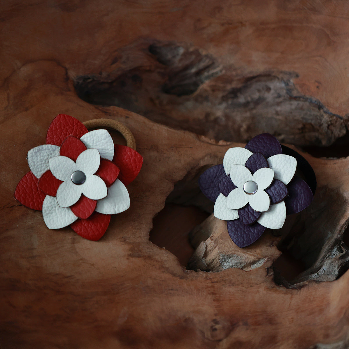 - Stilvolles Design: Handgefertigte Lederblumen in eleganten Rot-Weiß- und Weiß-Violett-Kombinationen.